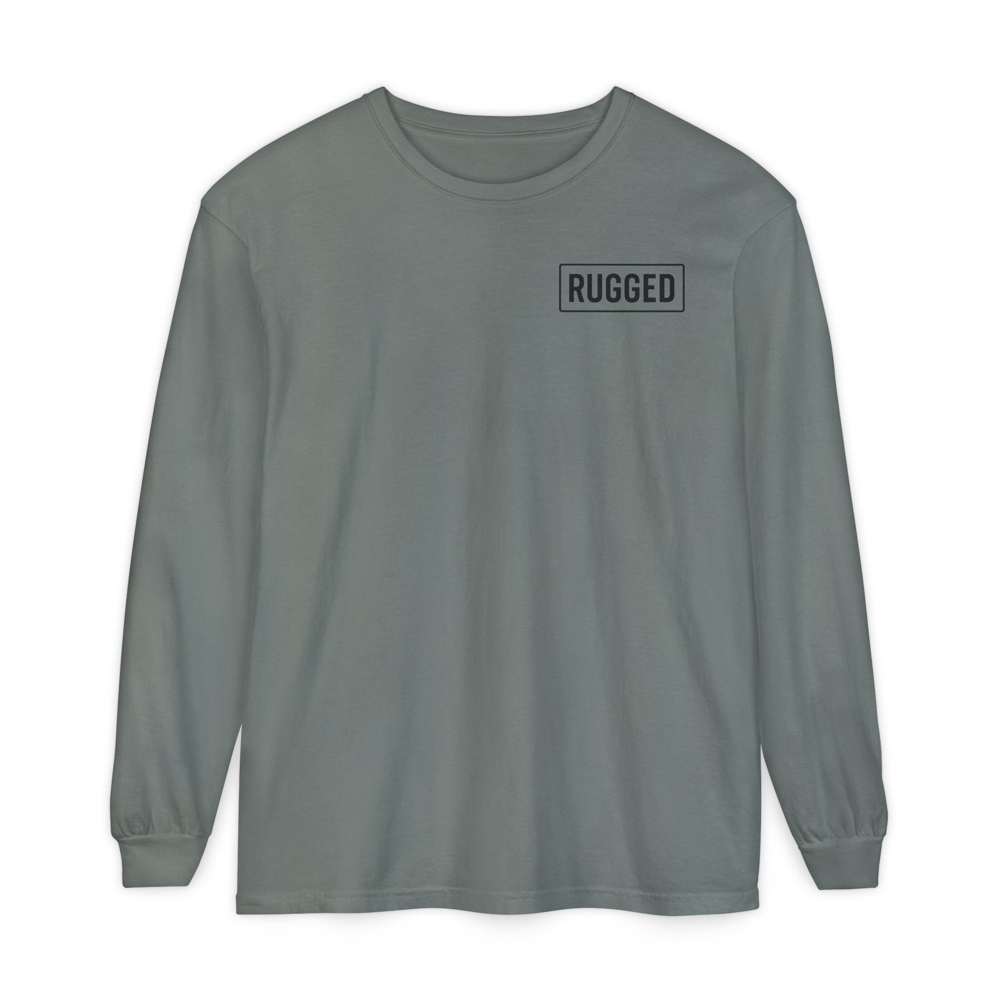 This Rugged & Rooted long-sleeve tee is made for cooler days, early mornings, and everything in between. Featuring a minimal RUGGED chest mark on the front and our bold shield logo with rooted pine across the back, it delivers comfort, durability, and unmistakable identity.