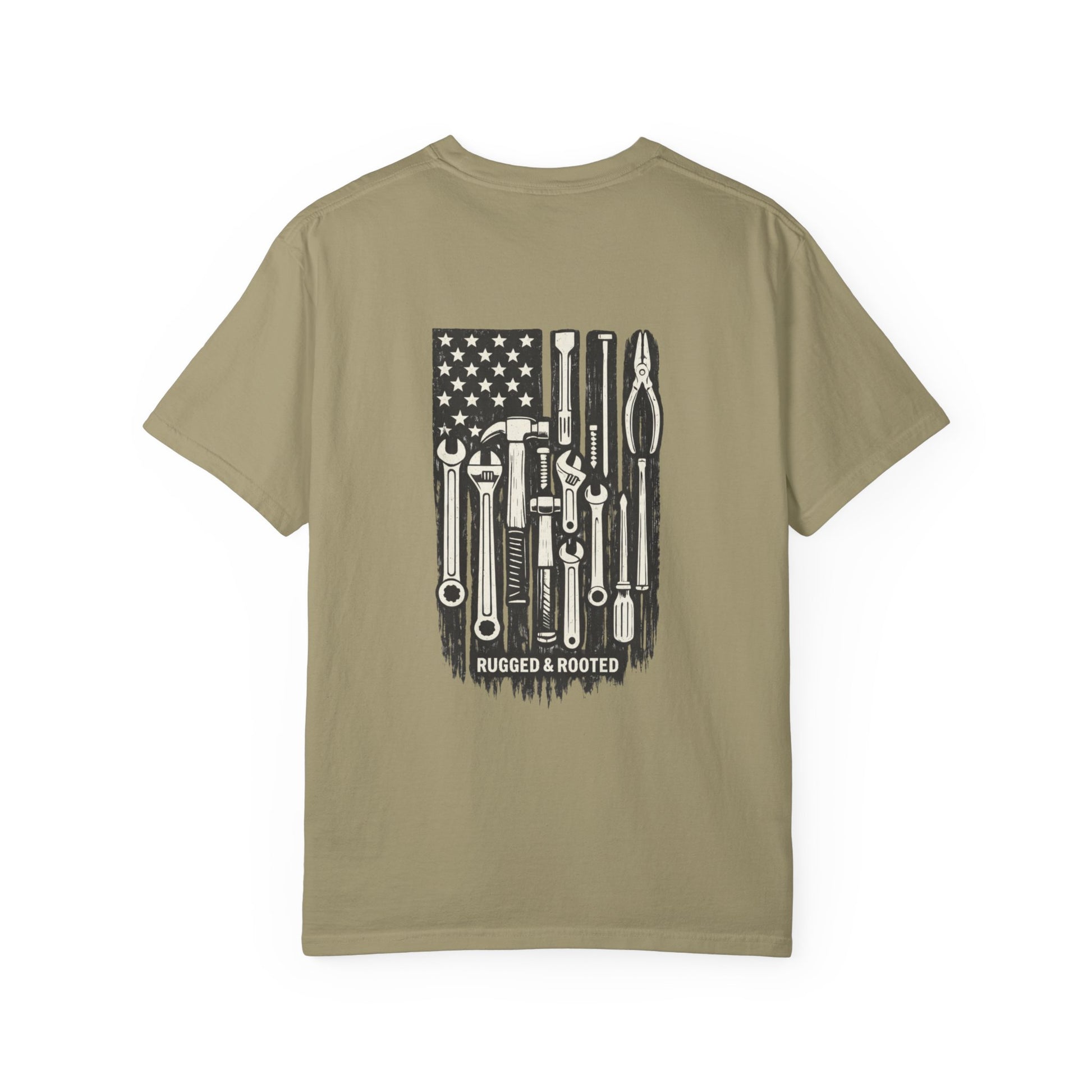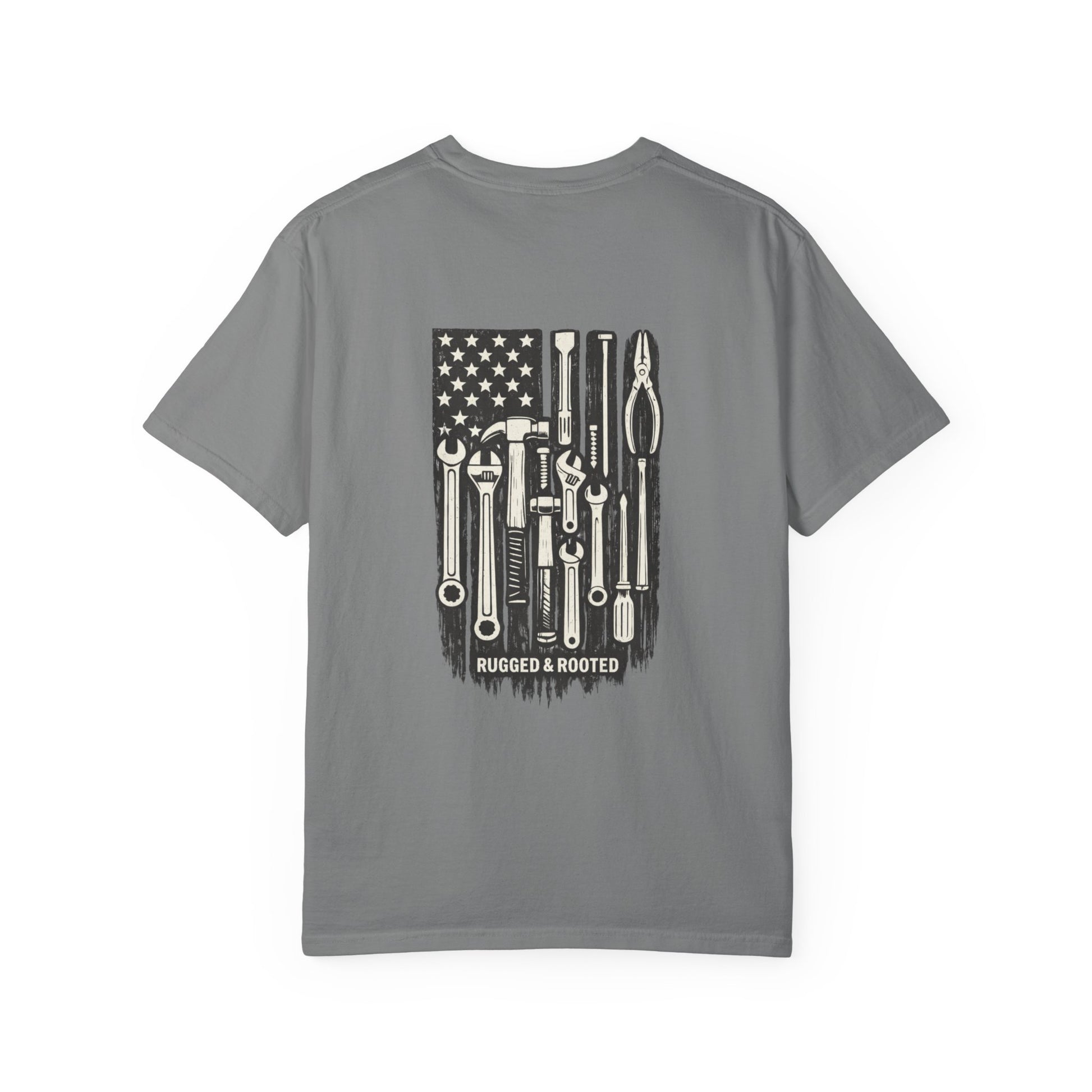 The Tool American Flag tee is made for blue-collar men who earn everything they have. Featuring a bold tool-flag graphic on the back and a clean Rugged & Rooted chest mark on the front, this shirt represents pride in craftsmanship, grit, and getting the job done right.